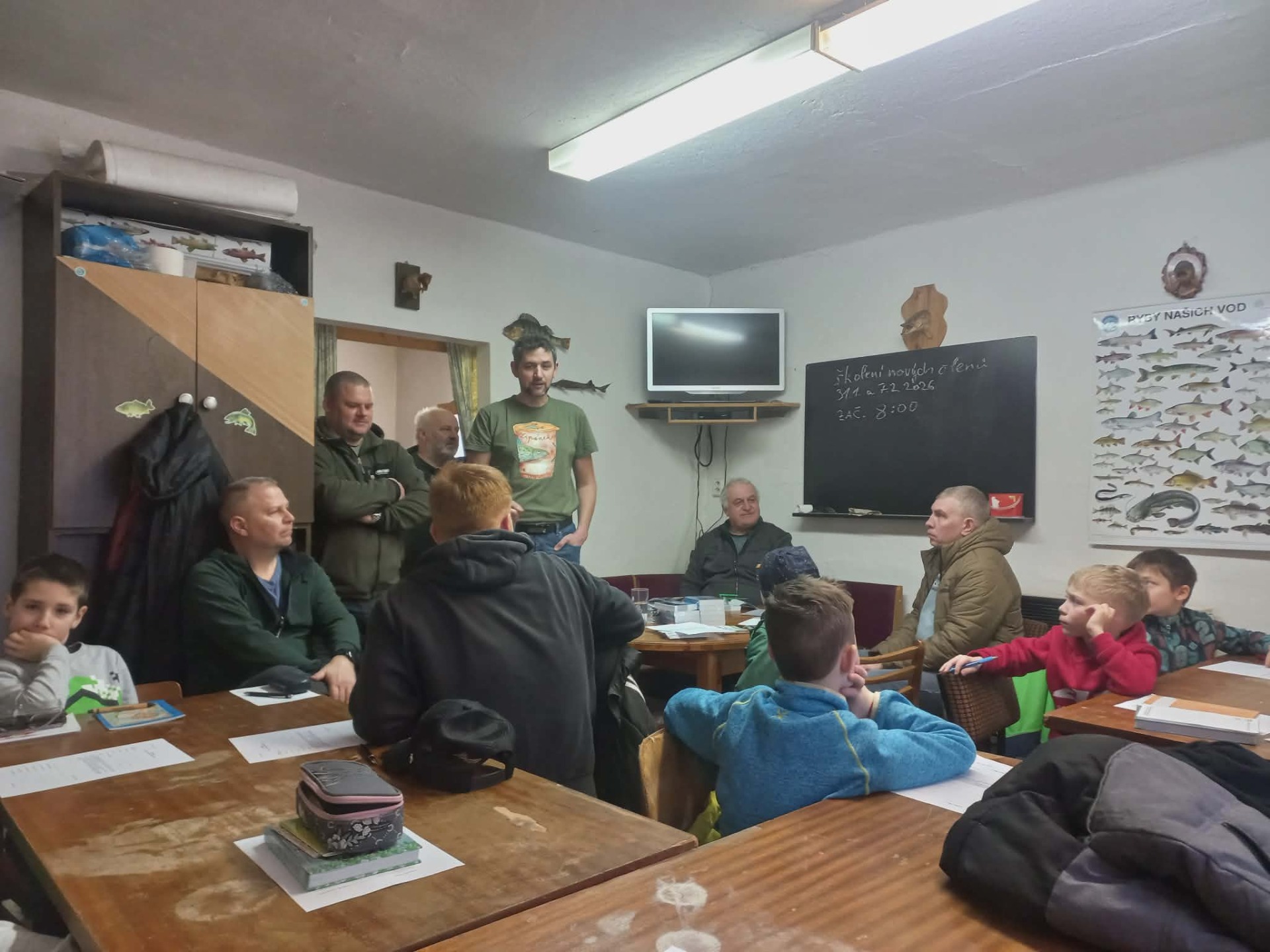 Školení nových členů Českého rybářského svazu místní organizace Golčův Jeníkov proběhlo v termínech 11. a 25. ledna vždy od 8 do 11:30 v areálu u rybníka Obecník. Tradičně jsme s novými členy probrali nejdůležitější části Rybářského řádu: lov ryb, způsob měření délky a nejmenší lovné míry vybraných druhů, denní doby lovu, doby hájení, povolené způsoby a technické prostředky lovu, práva a povinnosti rybářů. Následně jsme se zabývali určováním jednotlivých druhů ryb a dalšími praktickými tématy. Pro zpestření jsme využili modelů ryb, na nichž jsme si ukázali znaky jednotlivých druhů, řekli si jejich lovné míry a doby hájení. Reálné znaky jsme si ukázali na vypreparovaných rybách, či konkrétních kostech jako jsou požerákové zuby či čelistech pstruha obecného, candáta obecného a sumce velkého. Kromě ryb jsme se věnovali i poznávání a ekologii dalších živočichů žijící ve vodě a jejím okolí. Prohlédli jsme si značky a čipy, které se používají ke sledování ryb. Ukázali jsme si i lakmusové papírky k měření pH vody a vysvětlili si další významné parametry vody. Vzhledem k dostupnosti širokého spektra rybolovných prostředků jsme se vedle povolených způsobů věnovali i těm, které by prostřednictvím internetových obchodů mohly být dostupné, avšak jejich používání je legislativně zakázáno – např. vrše a pasti na ryby. Ukázali jsme si nový vzor rybářských lístků, způsob jejich vyplňování, a především kdy je nutné jednotlivé ponechané ryby zapisovat (vyjmenované druhy bezprostředně po ulovení, ostatní možno sumárně před odchodem od vody). Prohlédli jsme si i hospodářské vybavení používané především během výlovů rybníků – bedny k přepravě ryb, kesery, kádě, vaničky, kýble, přebírky a další. V teoretické části jsme kladli důraz na osvětu chování při rybolovu a při střídání revírů. Je důležité rybářské vybavení nechat přinejmenším důkladně vyschnout, abychom omezili šíření nemocí a parazitů ryb – například rybomorek. Jako každý rok, i letos bylo součástí školení kreslení spojené s literární činností. Rybářská mládež dostala za úkol nakreslení a vlastními slovy popsat pstruha duhového. Článek o školení byl publikován v místním Periodiku Listy z Golčova Jeníkova.